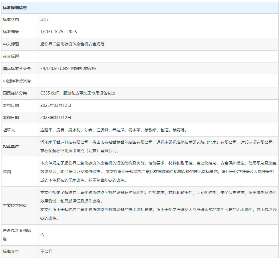 中国国际经济技术合作促进会发布的T/CIET 1075—2025《超临界二氧化碳流体染色机安全规范》团体标准遵循开放、公平、透明、协商一致和促进贸易和交流的原则,按照在本平台公布的《标准制定程序文件_CIET》制定。T/CIET 1075—2025《超临界二氧化碳流体染色机安全规范》团体标准规定的内容符合国家有关法律法规和强制性标准的要求,没有侵犯他人合法权益。